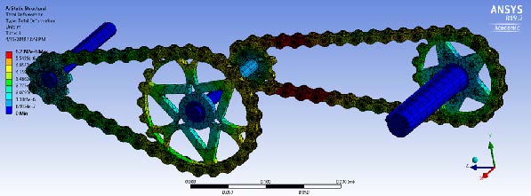 In this project, it is intended to design a two chain sprocket mechanisms to transmit power from the motor to the wheel of the AUB super mileage vehicle. A two-stage gear system was excluded because of the dimensional limitations of the design. Also, belts are not efficient because of the significant power loss. The vehicle is required to accelerate and then cruise at 30 mph at a supplied angular velocity of 3600 rpm. It is also required to accelerate rapidly to reach 3600 rpm in a short time and that is achieved by more frequent burns until a constant burn is maintained. Based on weight, cost, fatigue strength, and contact stresses, a material is to be selected. Stainless steel was found to have the perfect specification for the application. Moreover, the material index proposed should be optimized to incorporate dimensional considerations (width of gears etc.. . . ). Using SolidWorks, the chain-sprocket systems were mounted over the assembly of the motor. In the following week, finite element analysis (ANSYS) will be used in order to enhance the design and compensate for stress concentrations.